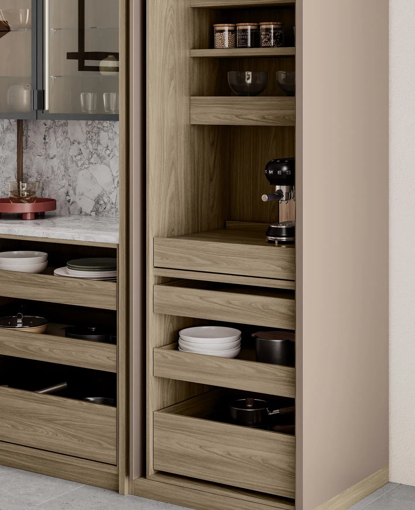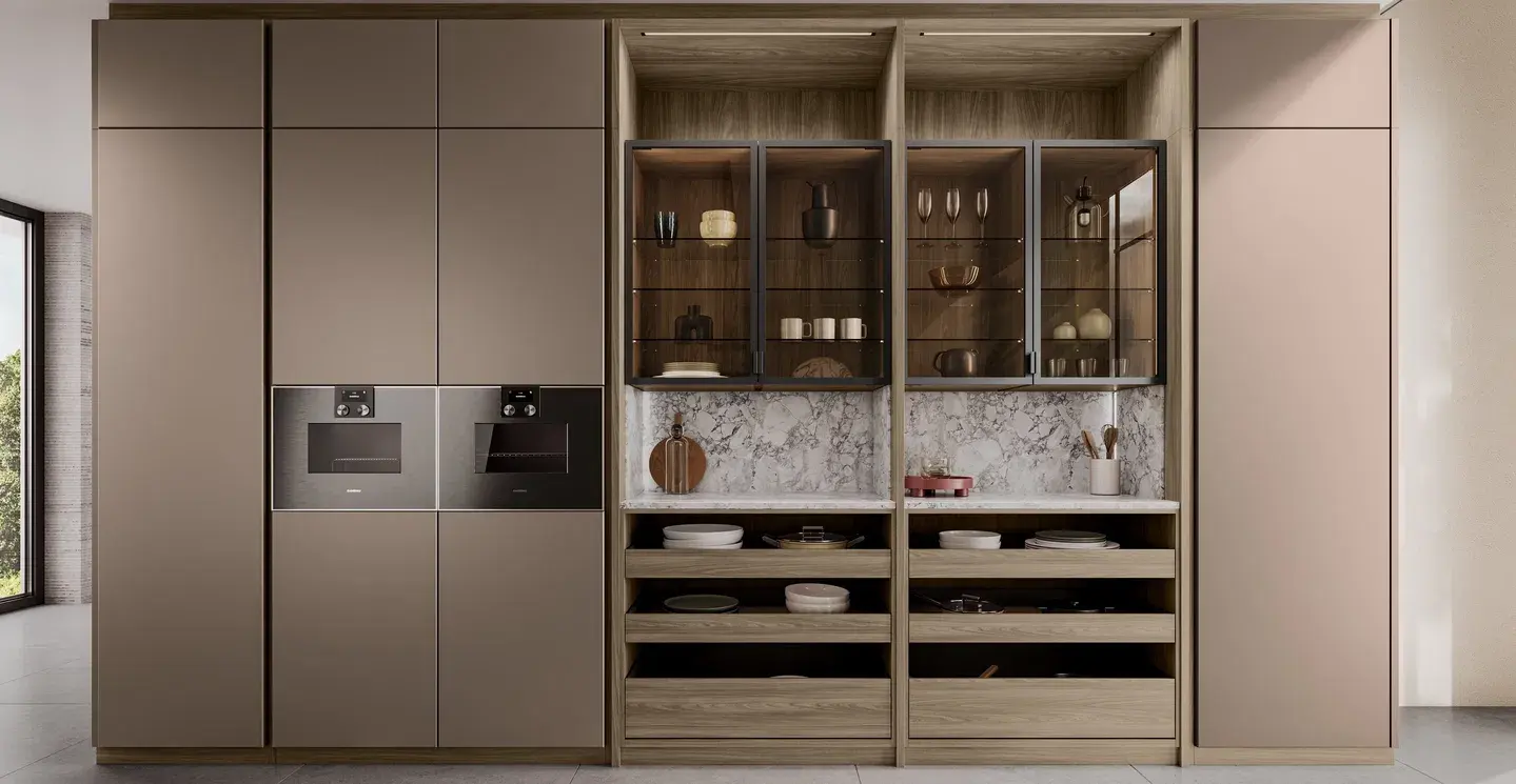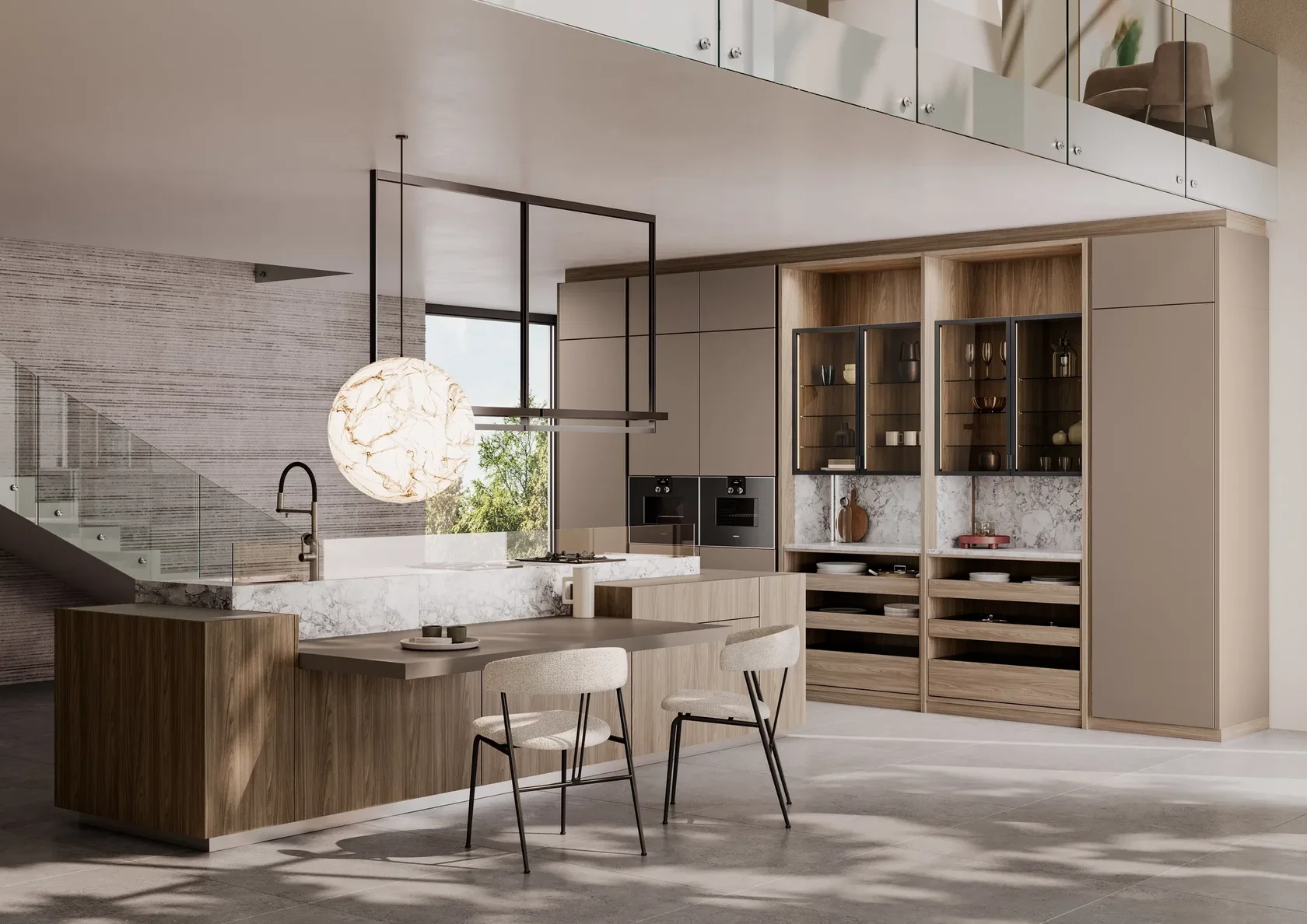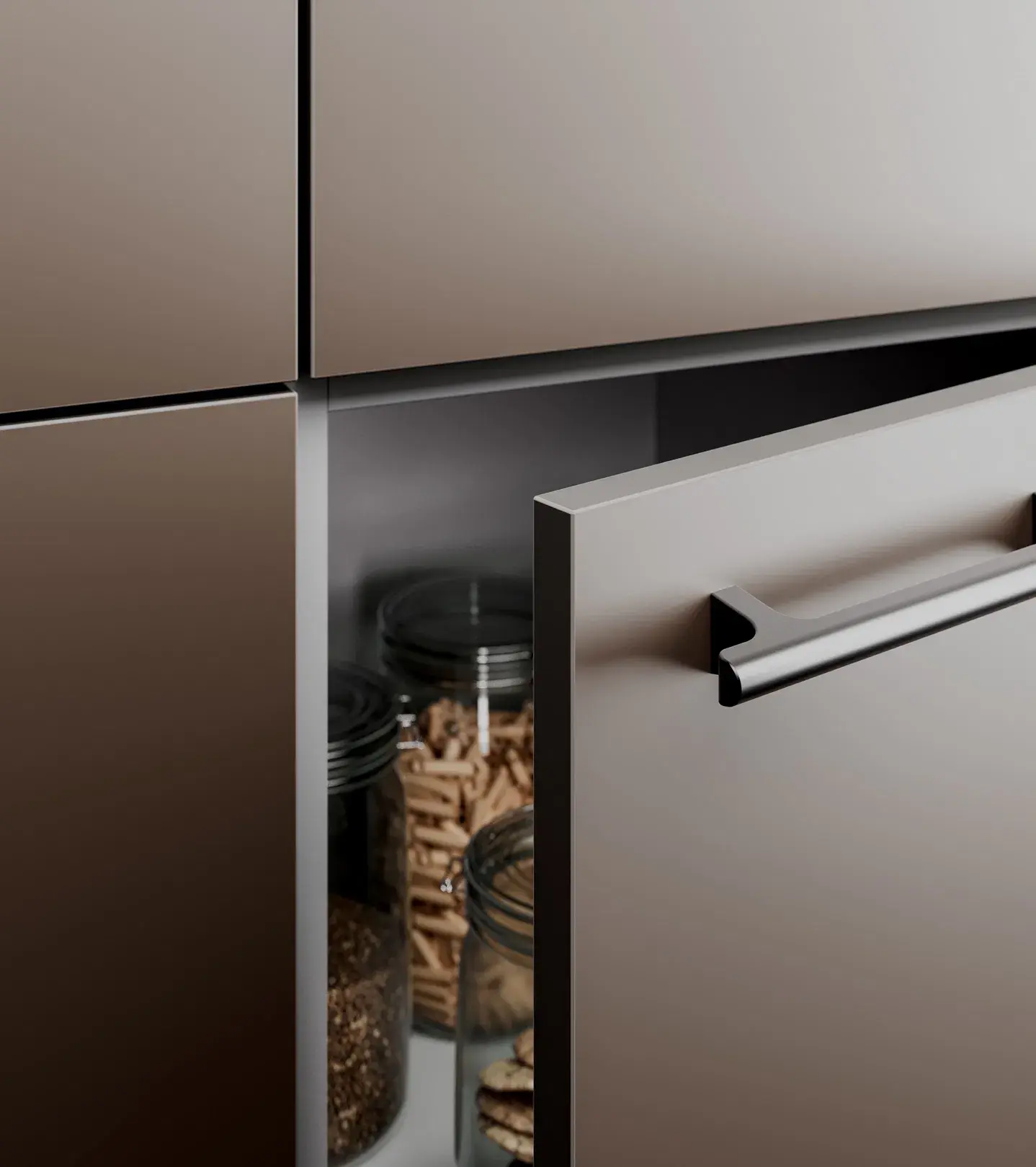 Особое место среди инновационных решений занимает система IDEA — уникальная поверхность из высококачественного акрилового стекла. Она характеризуется матовой, непрозрачной структурой и эффектом глубины, вдохновленным эстетикой стекла. Эта поверхность не только визуально расширяет пространство, создавая ощущение спокойствия и гармонии, но и обладает высокой практичностью: она устойчива к царапинам, ударам и воздействию ультрафиолетовых лучей, что делает её идеальным выбором для кухни, которая воспринимается как место постоянного использования.
